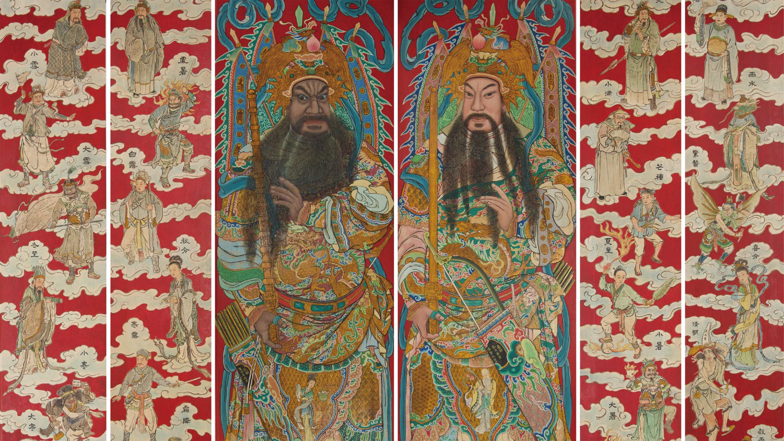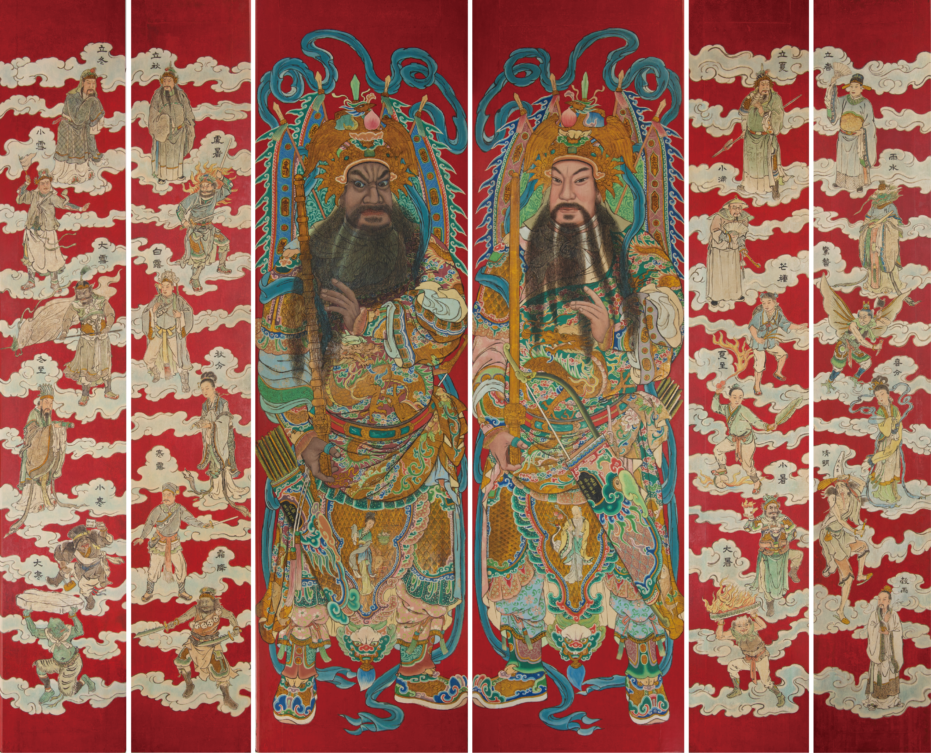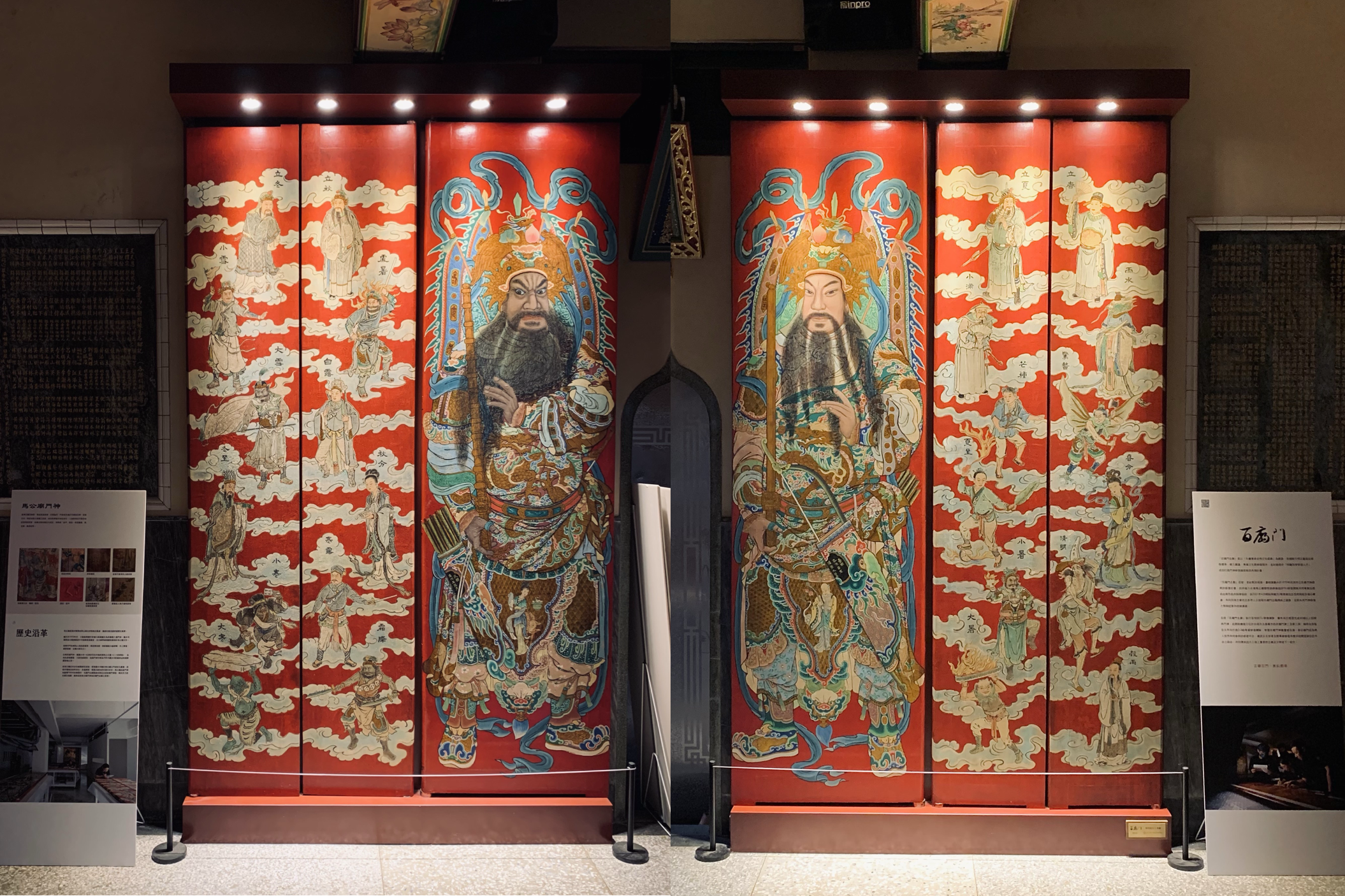 馬公廟門神明間中門為廣為人知的尉遲恭、秦叔寶,儀態大器磅礴、作工繁複、細節甚豐。另次間四扇門神繪製24節氣,神祇姿態靈動,力度、美感兼具,為70年代麗水司彩繪黃金時期的華麗登場之作,亦是麗水司少數完整保留之24節氣主題作品。