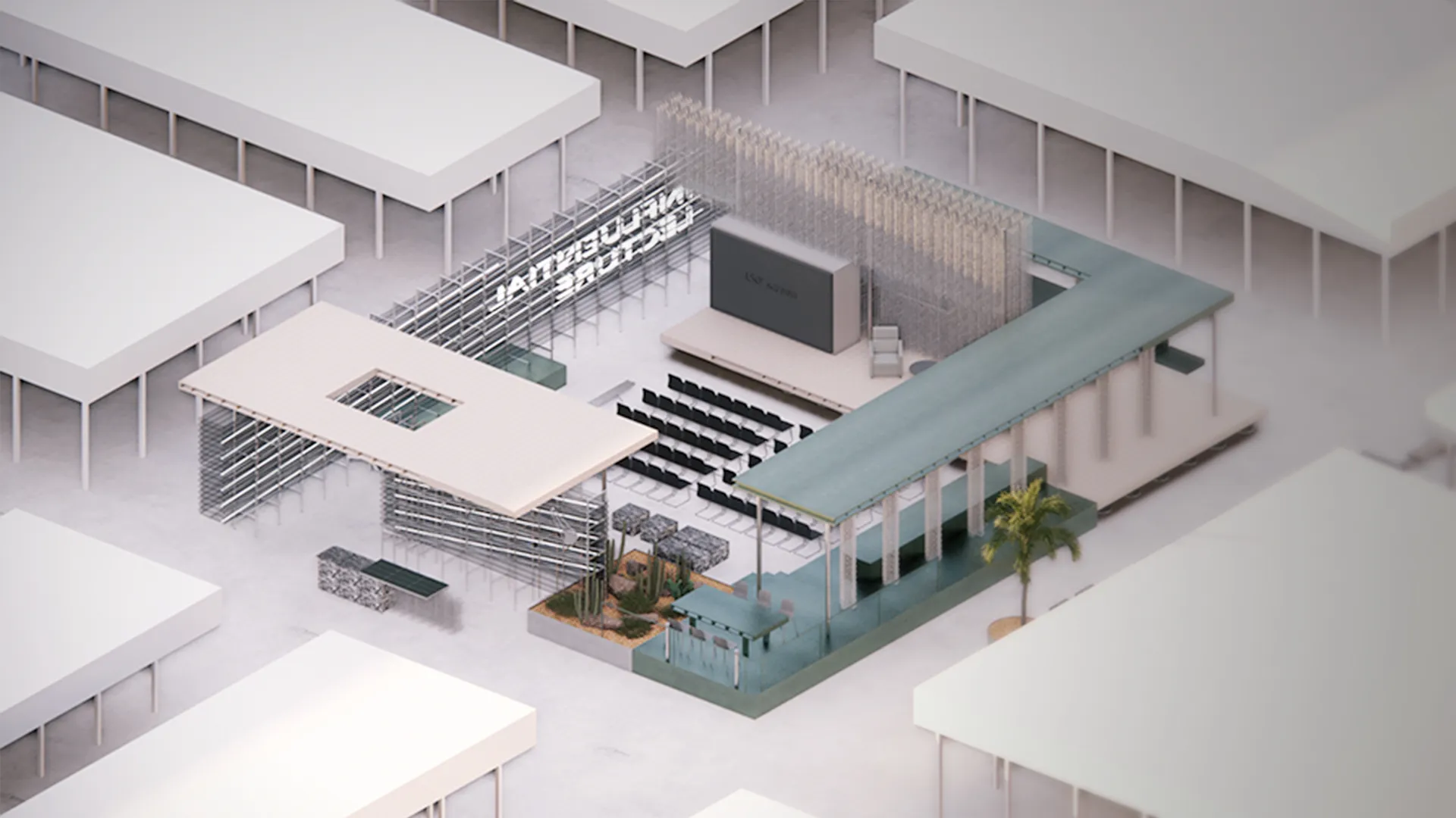 【影響力講堂】講堂搭建攜手「PRIOR OBJECT 先驗物件」打造實驗性的空間創作。將金屬擴張網彎折成柱體或牆體,金屬方管和圓管堆疊成可坐臥的結構,柏油瀝青澆製打磨成光滑立面,壓縮鋁罐二次加工成桌椅或堆疊空間。這些材料經過冷接處理(如切削、彎折、壓縮等低溫工作),既能回應環保意識與高資訊流量時代的需求,也能呼應好感空間展在永續策展理念的落實。